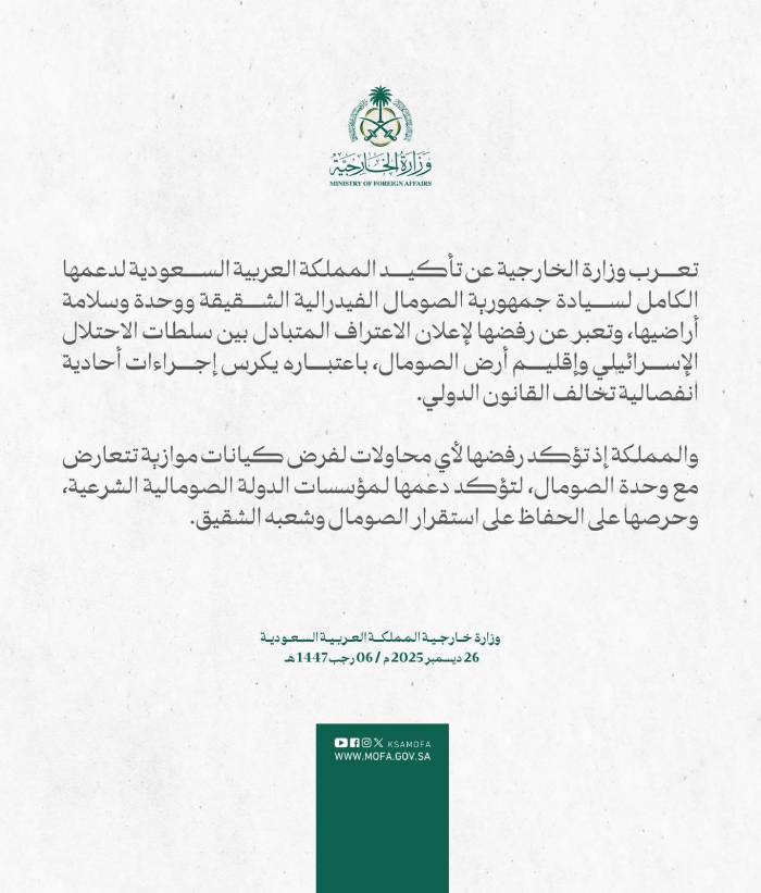 *وقّع رئيس الوزراء ووزير الخارجية جدعون ساعر، ورئيس جمهورية أرض الصومال عبد الرحمن محمد عبد الله، إعلانًا مشتركًا ومتبادلًا يُرسي هذا الاعتراف.