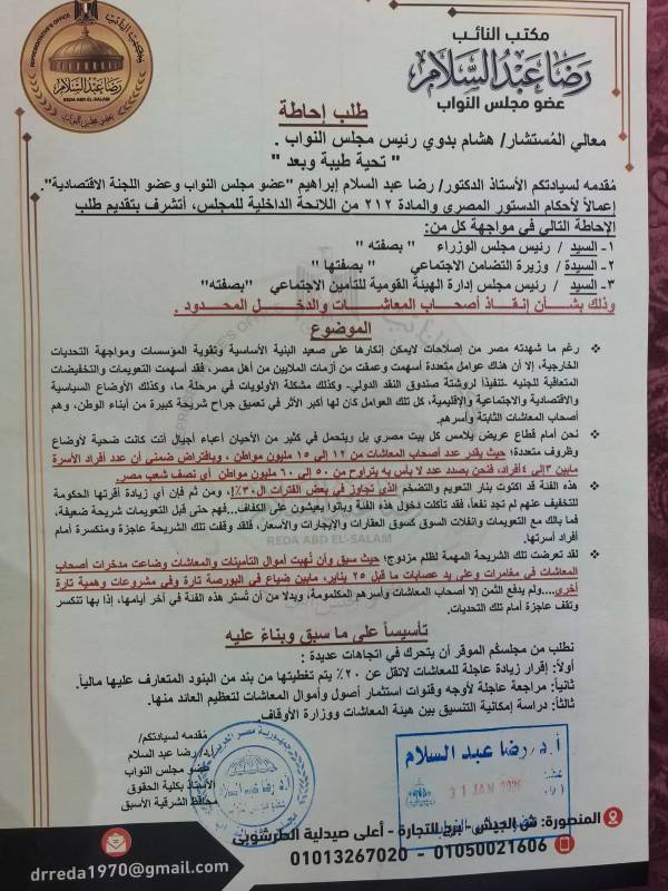 وانطلاقًا من دوري الرقابي، فقد تقدمتُ بالفعل بطلب إحاطة في هذا الشأن، استجابةً لما أثاره القرار من قلق واسع وغضب مجتمعي، تأكيدًا على أن الاستقرار الاقتصادي والاجتماعي لا يتحقق بقرارات مفاجئة، ولا بتجاهل أثرها التراكمي على مختلف فئات الشعب.